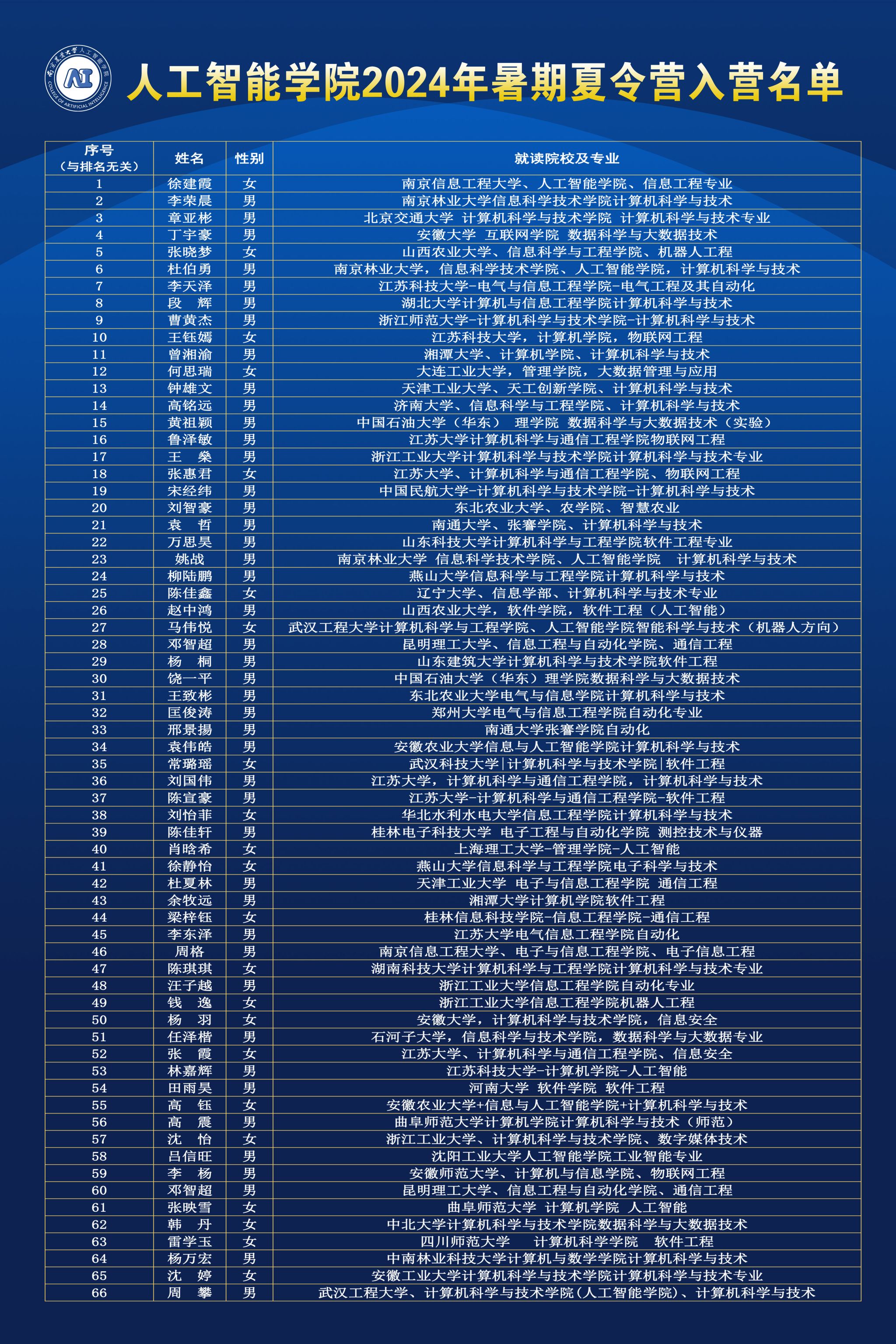 现将2024年麻豆tv 麻豆tv 优秀大学生暑期夏令营入营名单公示如下: