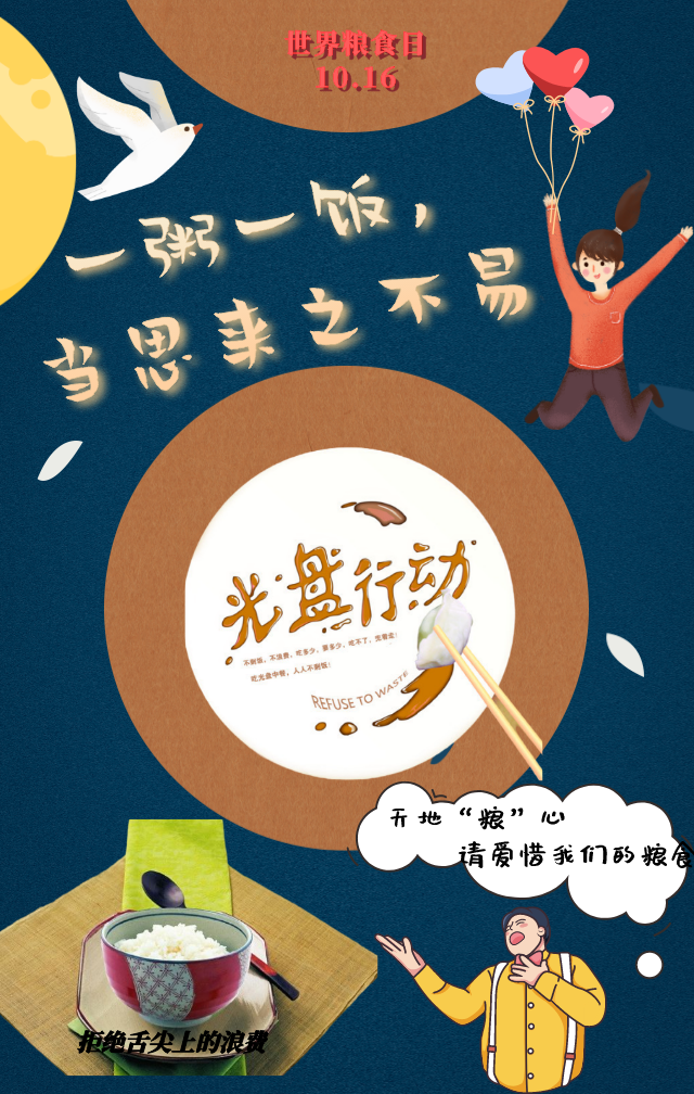 “美好‘食’光,拒绝浪费”青年光盘行动主题实践活动正在火热进行中,大家都在用自己的方式响应着光盘行动的号召。据联合国统计,世界76.33亿人口中至少还有8.2亿面临饥饿,而全球每年约1/3的粮食被损耗和浪费,总量约为每年13亿吨。可能你浪费的每一粒粮食,对于他人来说已是弥足珍贵的救命食。节约是美德,节约是风尚,珍惜一汤一粟,养成节约习惯,让我们一起行动起来,引领光盘的新“食”尚,守护我们“舌尖”上的文明!