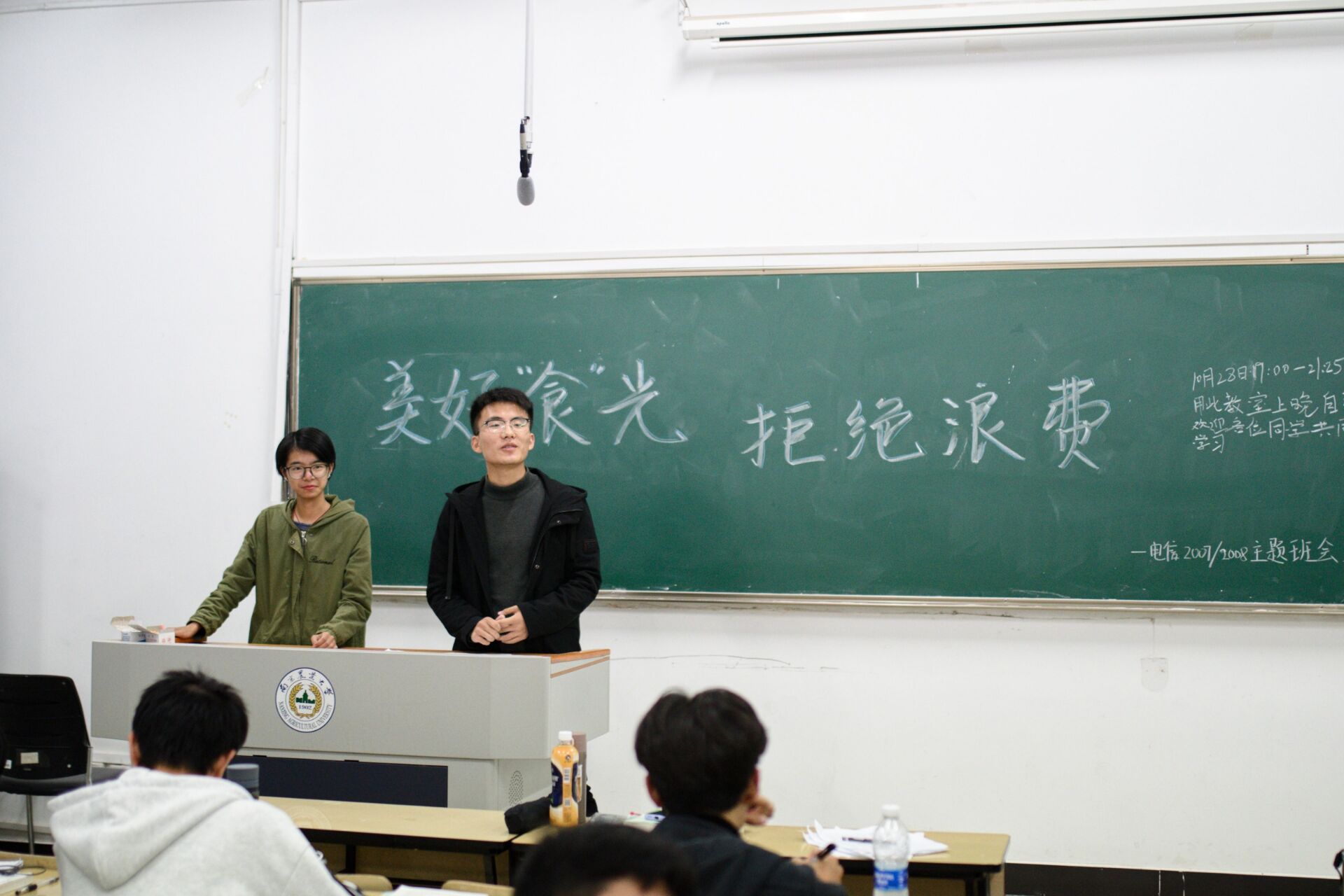 电信类2007/08的同学们在班会上积极交流,并表示课后要将光盘行动落到实处,不仅在校内食堂,而且在走出校门后依然不忘做好光盘行动。