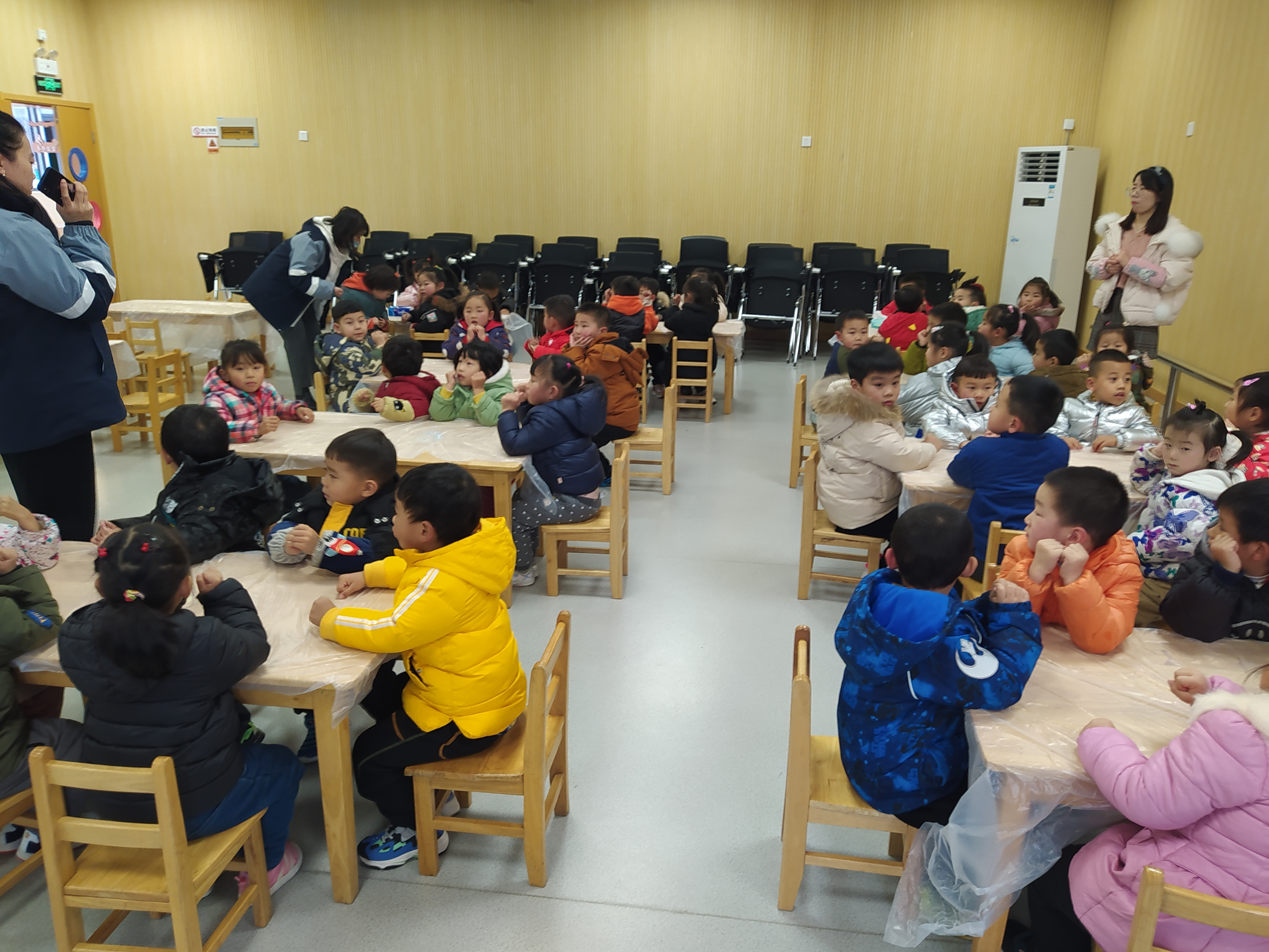下午一点半志愿者到达幼儿园布置场地并引导小朋友们有序入场。活动正式开始后,主持人通过讲解PPT和播放动画片的方式向小朋友们宣传冬至日的相关知识。随后,台下的志愿者将提前准备的小礼物送给表现好的小朋友,激发了小朋友们参与活动的积极性。过程中,小朋友们全神贯注,积极回答问题,在不知不觉中对冬至有了更深的了解。