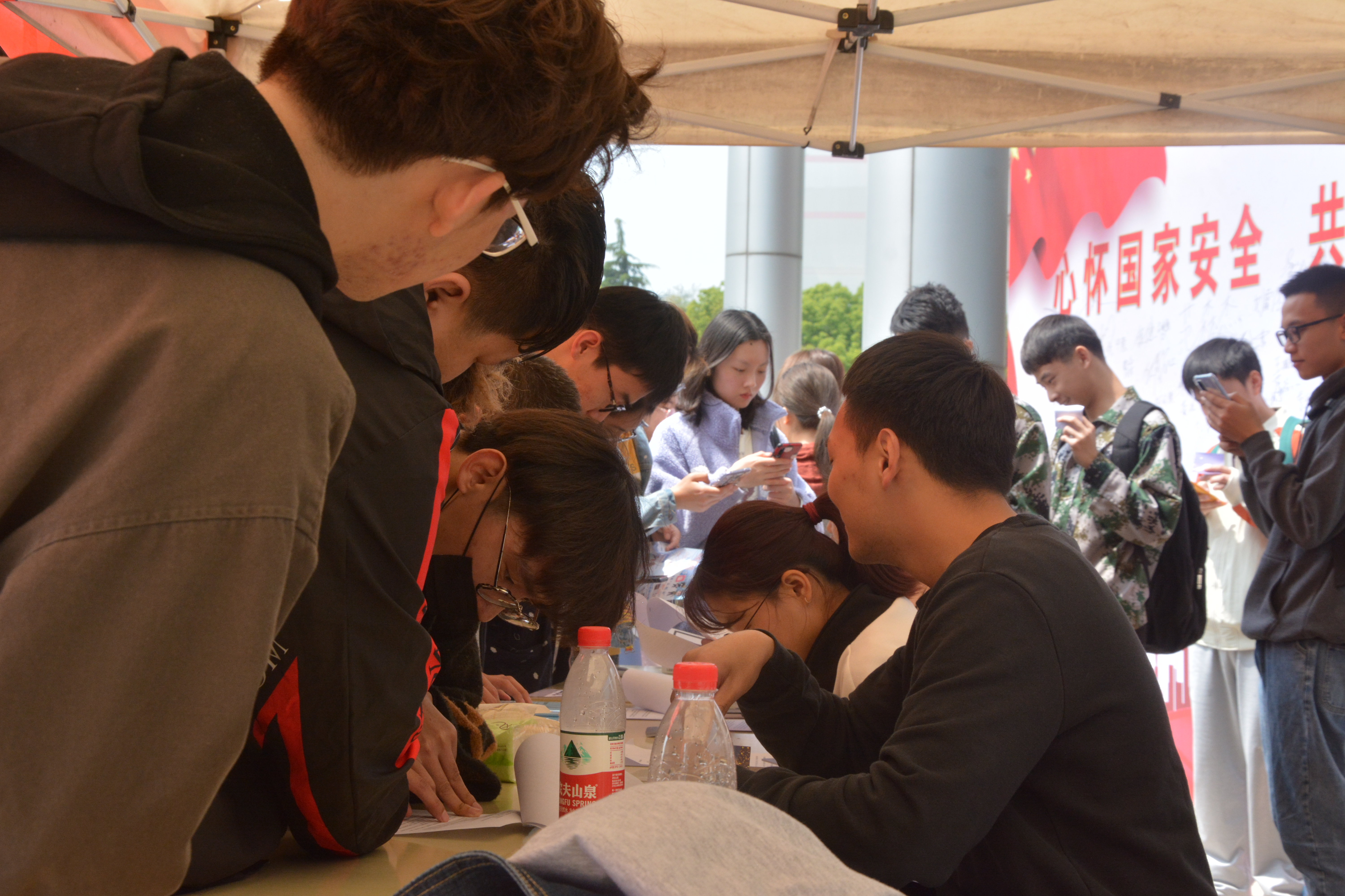 相关负责老师参与活动互动,积极解答师生问题。活动现场人潮涌动,数百名同学积极参与了关于国家安全知识的问答游戏,完成后,参与者们纷纷在签名墙上留下了自己的名字并拍照留念。