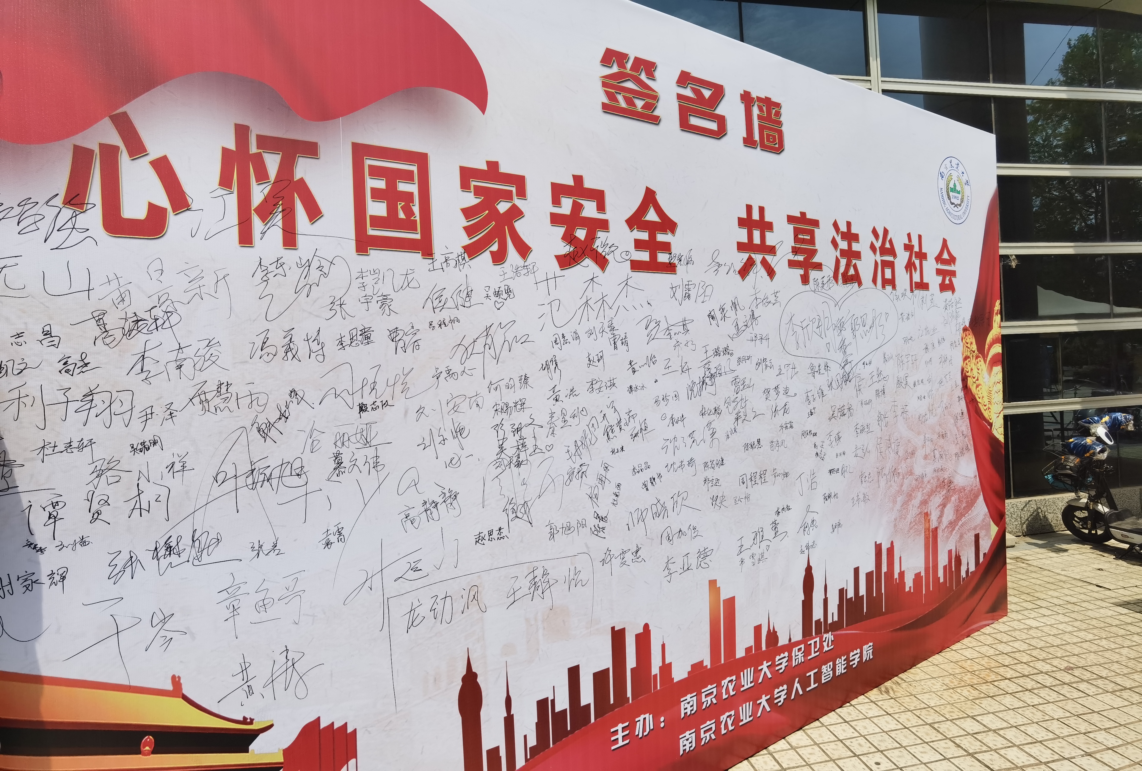与此同时,在润泽园广场举办了“心怀国家安全,共享法治社会”主题签名墙活动,南京市公安局江北新区分局团委书记鲁腾飞、泰山新村派出所大桥社区民警孙兴、新区分局关工委同志、校保卫处和麻豆tv