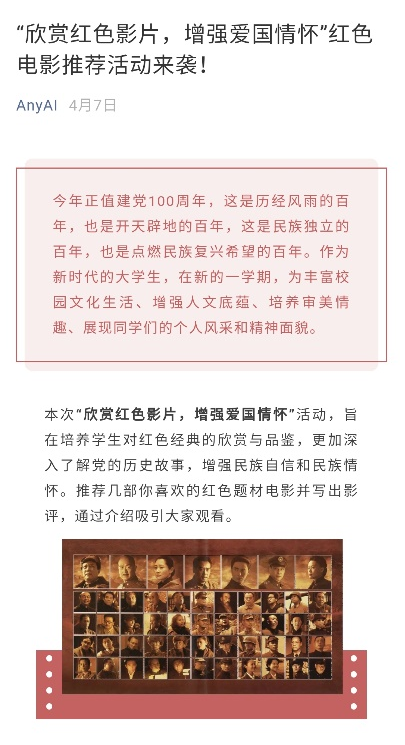 举办了线上“欣赏红色影片,增强爱国情怀”红色主题电影推荐活动,在银幕前重走党的发展之路,在笔尖下感悟中国共产党人的革命精神。