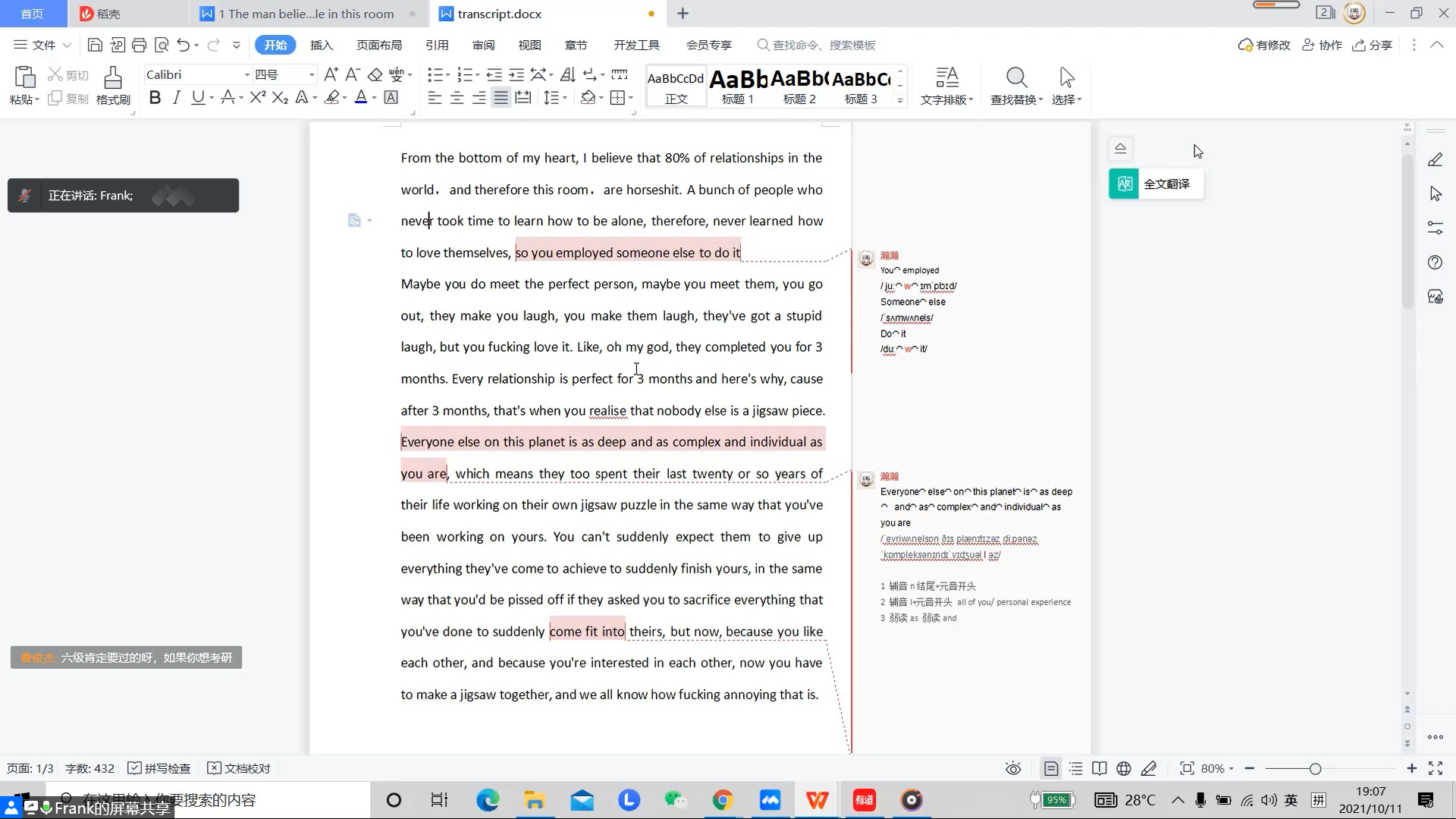 讲座开始,郑文瀚先从听力考试“实力大于技巧”这一方面讲起,他结合同学们在高中时学习英语的方法,点明了大学英语的学习更需要扎实的实力基础,并以同学们日常生活中的游戏以及社交为例说明英语基础的重要性。随后,郑文瀚以一段英语脱口秀音频为题进行了一次听力小测验,他在与同学们的问答互动中提出了英语连读和重读等问题,然后以读写的方式详细地讲解了一些简单的英语连读。讲座最后,郑文瀚强调了音标学习的重要性,点明了一些听力练习时易入的误区,并且为同学们推荐了一些英语听力练习材料。