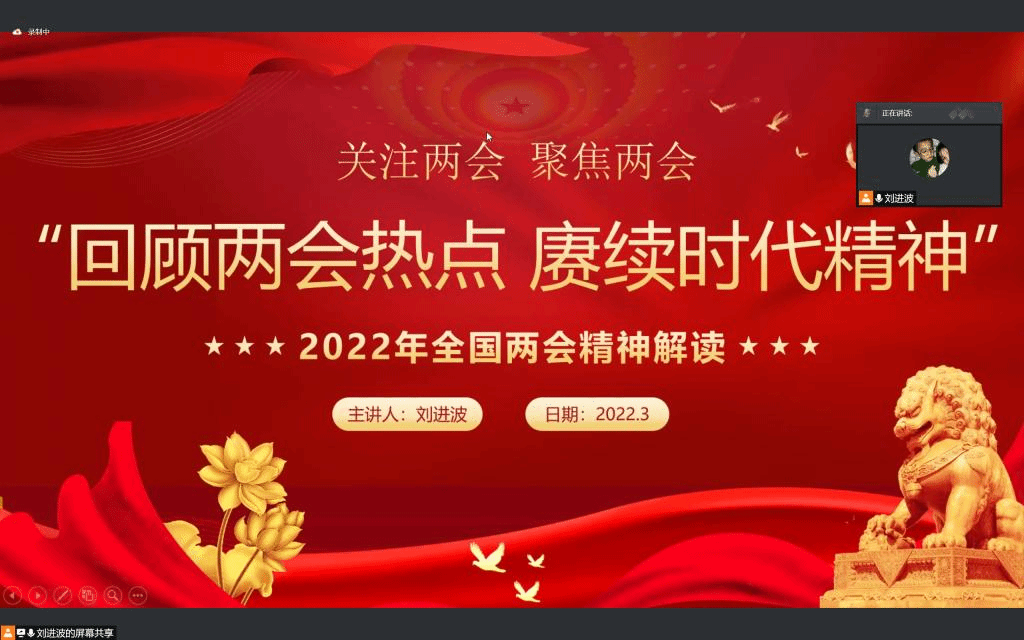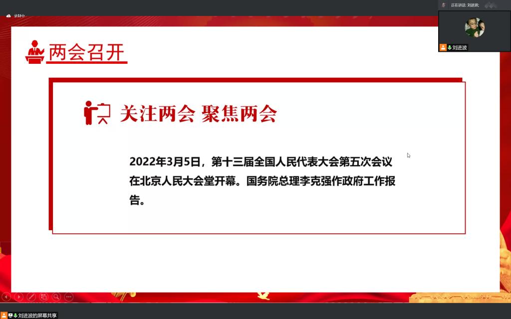 交流会开始,刘进波提出本次交流会的目的:关注两会,聚焦两会。本次交流会从2021年政府工作回顾、2022年主要预期目标以及2022年政府工作任务三个方面进行学习。接着提出了2021年是党和国家历史上具有里程碑意义的一年,“六稳”、“六保”工作落实到位,新发展理念贯彻落实。主持人的介绍让同学们明确面临的问题与挑战。就经济社会发展总体要求、发展主要预期目标及目标任务等方面阐述2022年国家主要预期目标。紧接着刘进波又通过两段视频,让我们深入了解两会所提出的2022年主要预期目标,以六个关键词加深对预期目标的阐释。之后提出以加快构建新发展格局,推动高质量发展,扎实做好各项工作为政府工作的主要任务,并从经济发展、民生发展、政府建设、外交建设、环境建设等十四个方面详细地阐述了2022年政府工作任务。最后,刘进波提出:中国的发展从来都是在应对挑战中前进的,中国人民有勇气、智慧和力量战胜艰难,呼吁同学们学习全国两会精神以赓续时代精神。至此,交流会圆满结束。