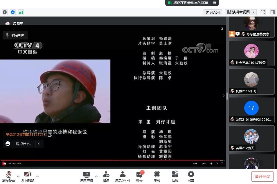 活动开始,主讲人向同学们说明了开展此次观影活动的主要目的是为了回忆与庆祝中国共青团成立一百周年以来的峥嵘岁月,以《青春中国》纪录片为载体,感受新时代、新青年的风貌。在观影活动过程中,无论是宋玺当兵练就钢铁意志,还是杨文平前往贵州山区执教,抑或是刘仔才八年磨剑铸就工匠精神,杨旭聪从事志愿服务主动下海清理垃圾,这几位当代青年的代表人物,都引起同学们的热烈反响。在影片结束的时刻,片尾响起了《我和我的祖国》的旋律,与会同学在聊天框中踊跃点赞,气氛达到了高潮。活动结束,主讲人对影片进行简单总结,并向大家提出希冀,期望同学们能够以这几位青春中国的代表人物为榜样,在属于我们的时代,肩负起青年人的时代责任。至此,本次活动圆满结束。