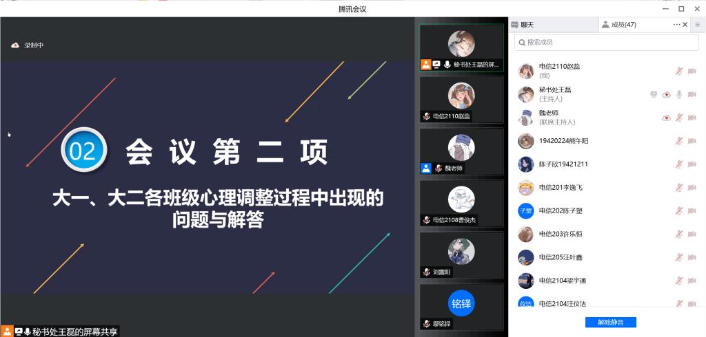 本次会议旨在就疫情期间同学们的共性心理问题进行探讨,提出解决方案,倡导各班级积极关注心理问题,正确引导。同时交流班级建设经验,探讨班级管理的有效方法,共同营造一个健康、积极向上的校园氛围,共建一个温馨、和谐的校园环境。