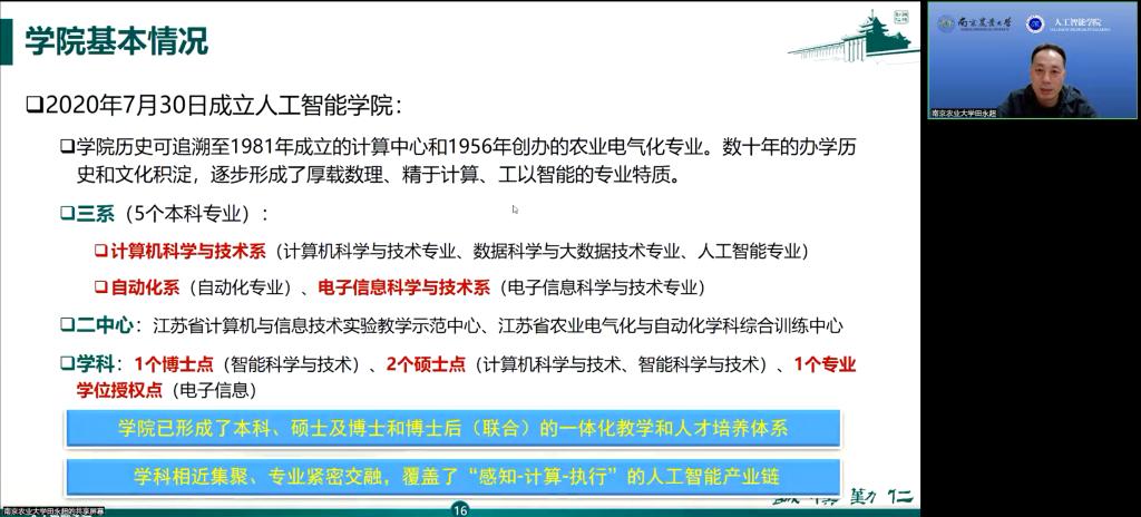 的发展历程以及各系、各专业的基本情况。他强调学院致力于科研创新,注重专业教学与科研相结合。在人才培养方面,学院拥有优秀的师资队伍,具有高级职称的教师占学院教师总数的70.1%,一直奉行“汇智,赋能”学院精神,聚力培养“通晓农业、厚载数理、精于计算、工以智能”的复合型人才。他指出,尽管麻豆tv