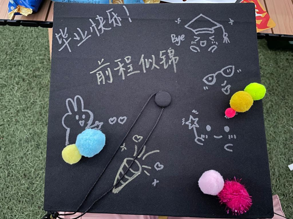 音乐会侧台则是院学生会文艺部支持下的DIY毕业帽设计活动,文艺部提供多顶毕业帽供同学们来设计使用,同学们可以自由发挥想象力来为毕业帽增添趣味元素,设计出多元且各具特色的毕业帽。参与者通过不同元素的设计搭配来表达对毕业生的真诚祝福,赋予毕业帽更加非凡的意义。