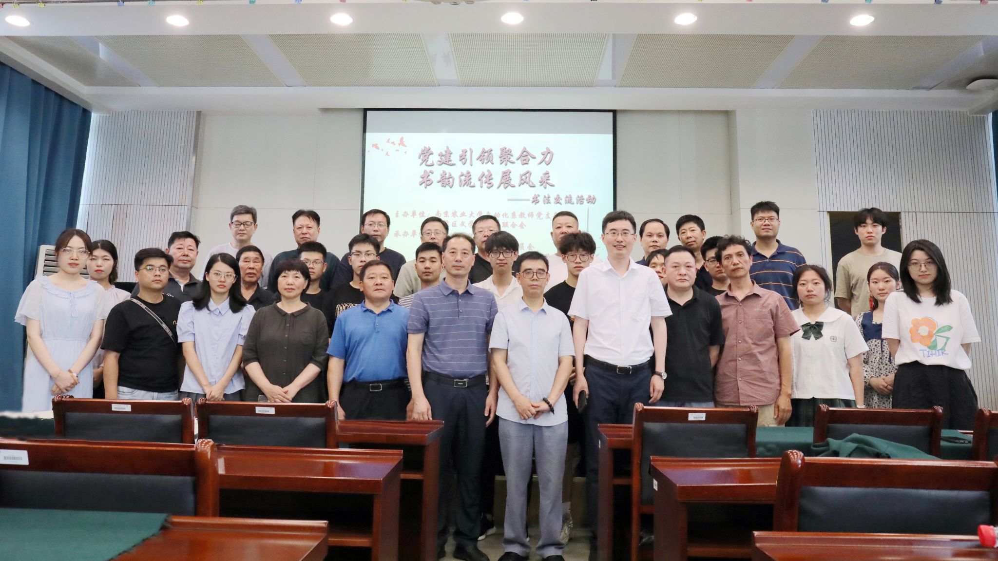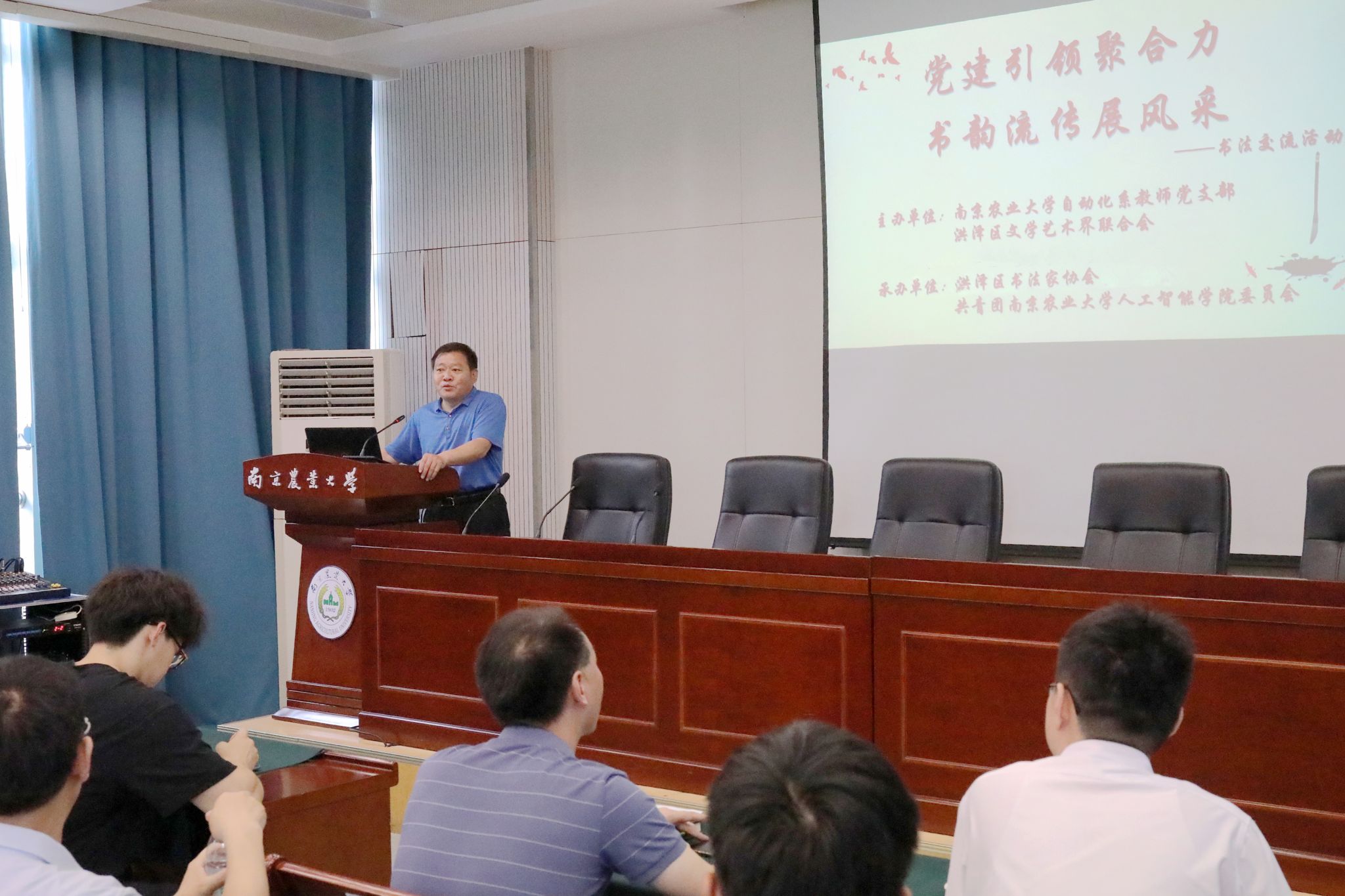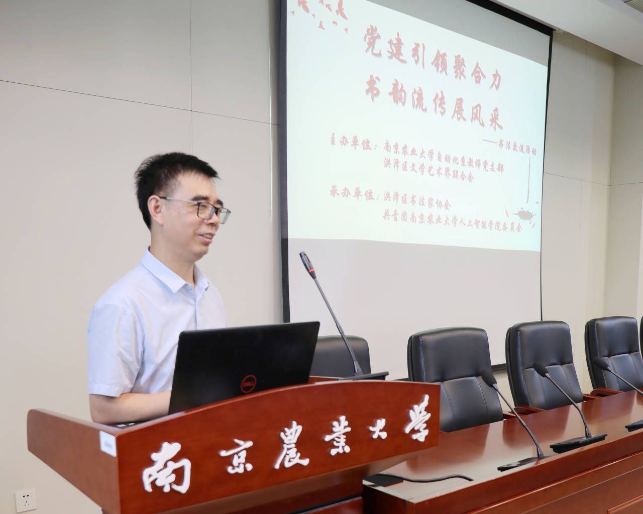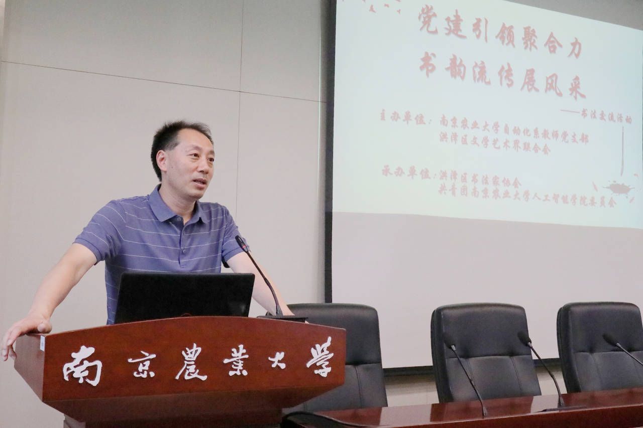 自动化系教师党支部主办。淮安市洪泽区委宣传部原常务副部长、洪泽区人大农经委主任、区书协顾问李大洋,原洪泽区文化局局长、洪泽区人大人代联委主任、区书协副秘书长赵劲松,原区文联主席、区书协顾问胡泽民,书协顾问孙林,中国书法家协会会员、江苏省文联书画研究中心研究员、洪泽区书法家协会主席束其虎,洪泽区书法家协会副主席楚靖、高正梅、徐仕刚以及区书法家协会作者代表出席了此次活动。