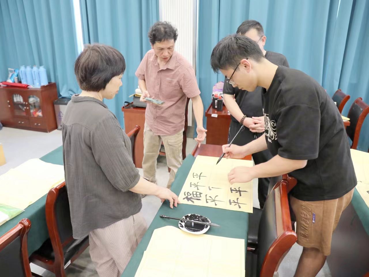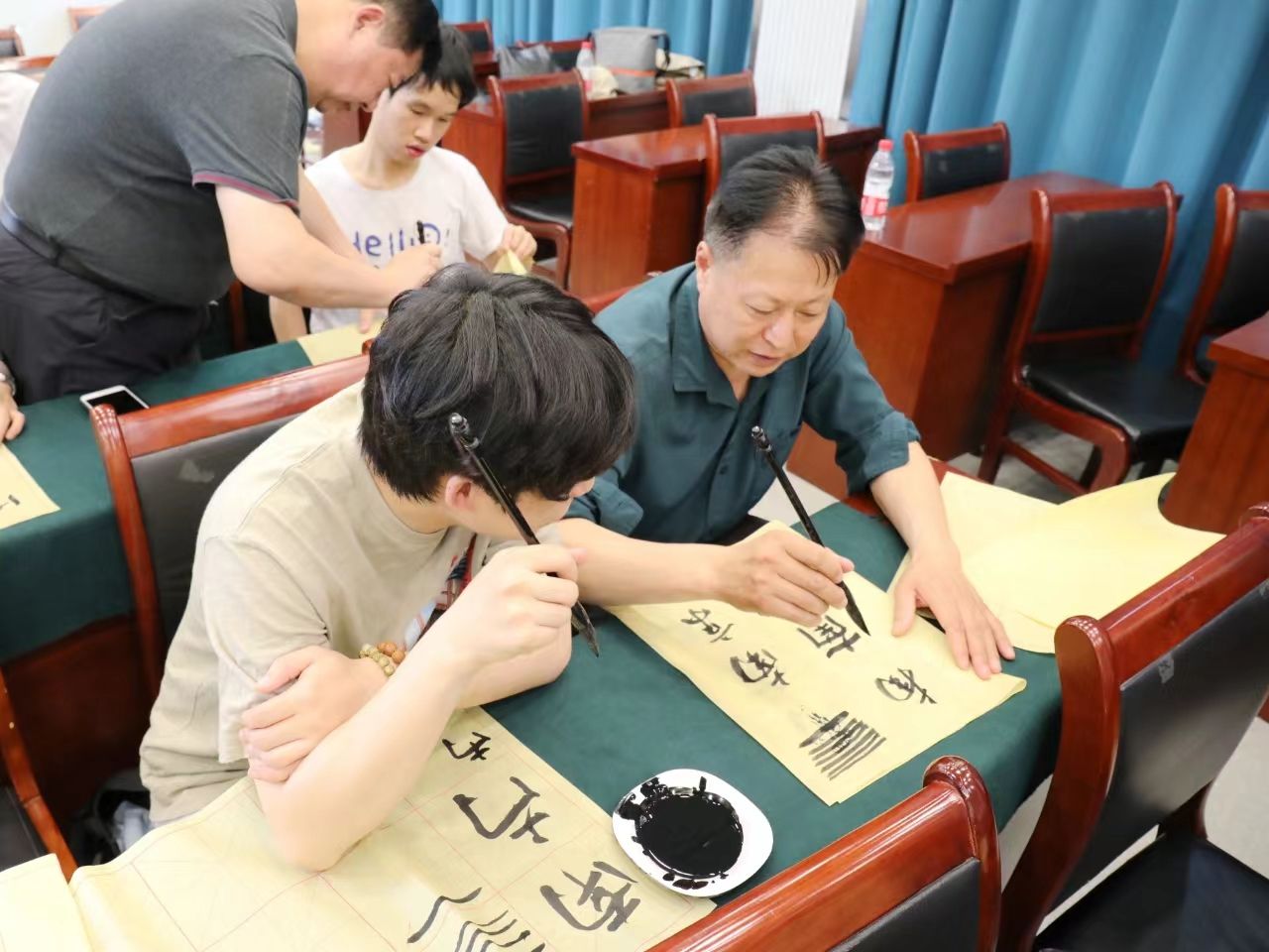自主体验环节,洪泽区书法家协会的各位老师为大家讲解书法的相关知识,并带领大家沉浸式体验书法艺术。每位师生都在书法名家的指导下认真学习并亲自提笔体验书写毛笔字,在墨香满屋的现场充分感受着书法所带来的乐趣,大家均受益匪浅并纷纷表示通过近距离接触优秀的书法作品、接触高雅艺术,真切感受到了中华传统文化的魅力。活动现场气氛热烈、成效良好。