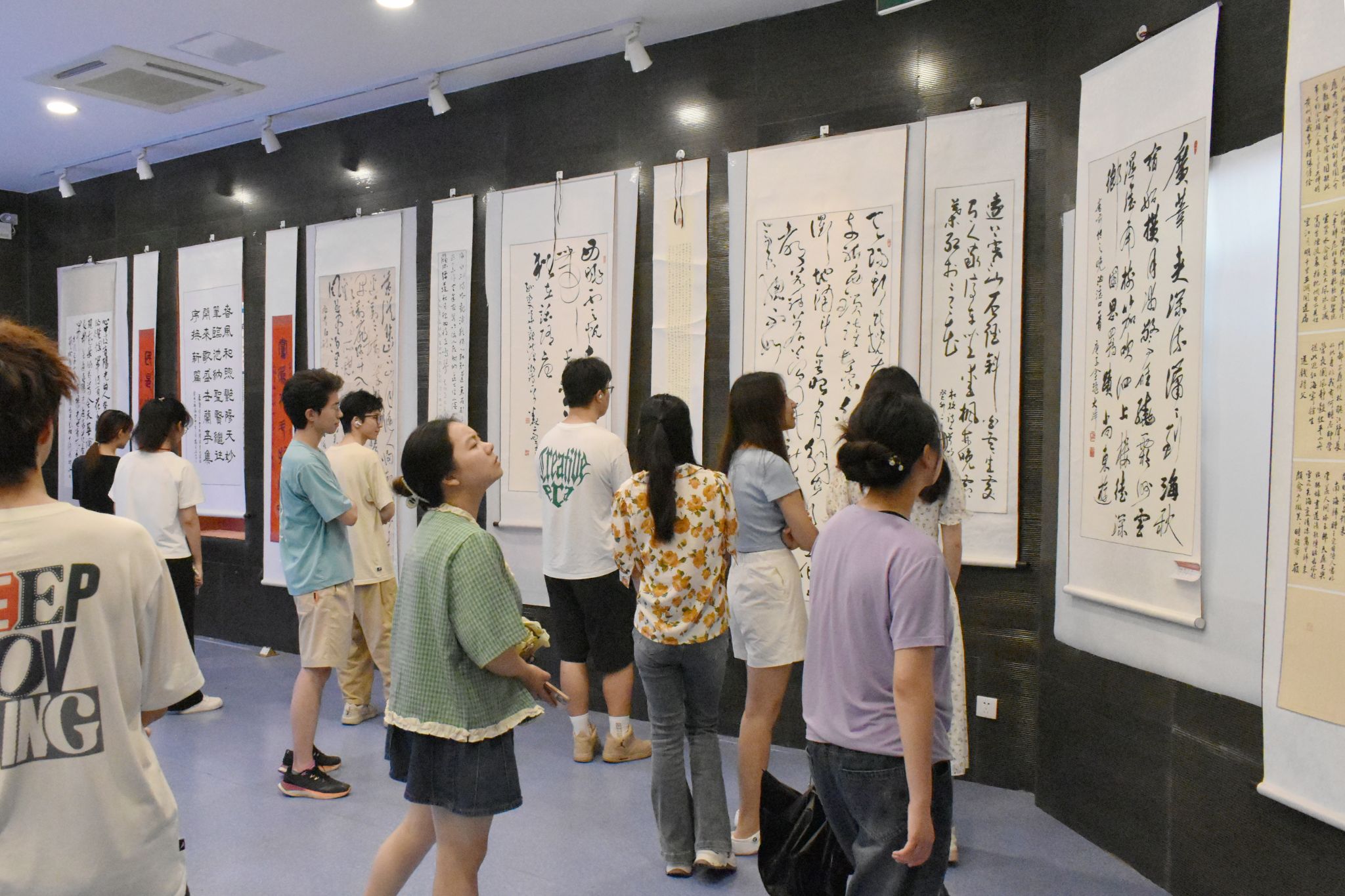 师生一行人在展览馆对洪泽区书法家协会诸位作者的作品进行欣赏参观,身临其境的感受笔走龙蛇的书法作品所带来的视觉冲击与震撼。束其虎等人详细介绍了每幅作品的字体形式、创作背景与其背后的意义,极大的加深了师生对书法文化的认知与了解。