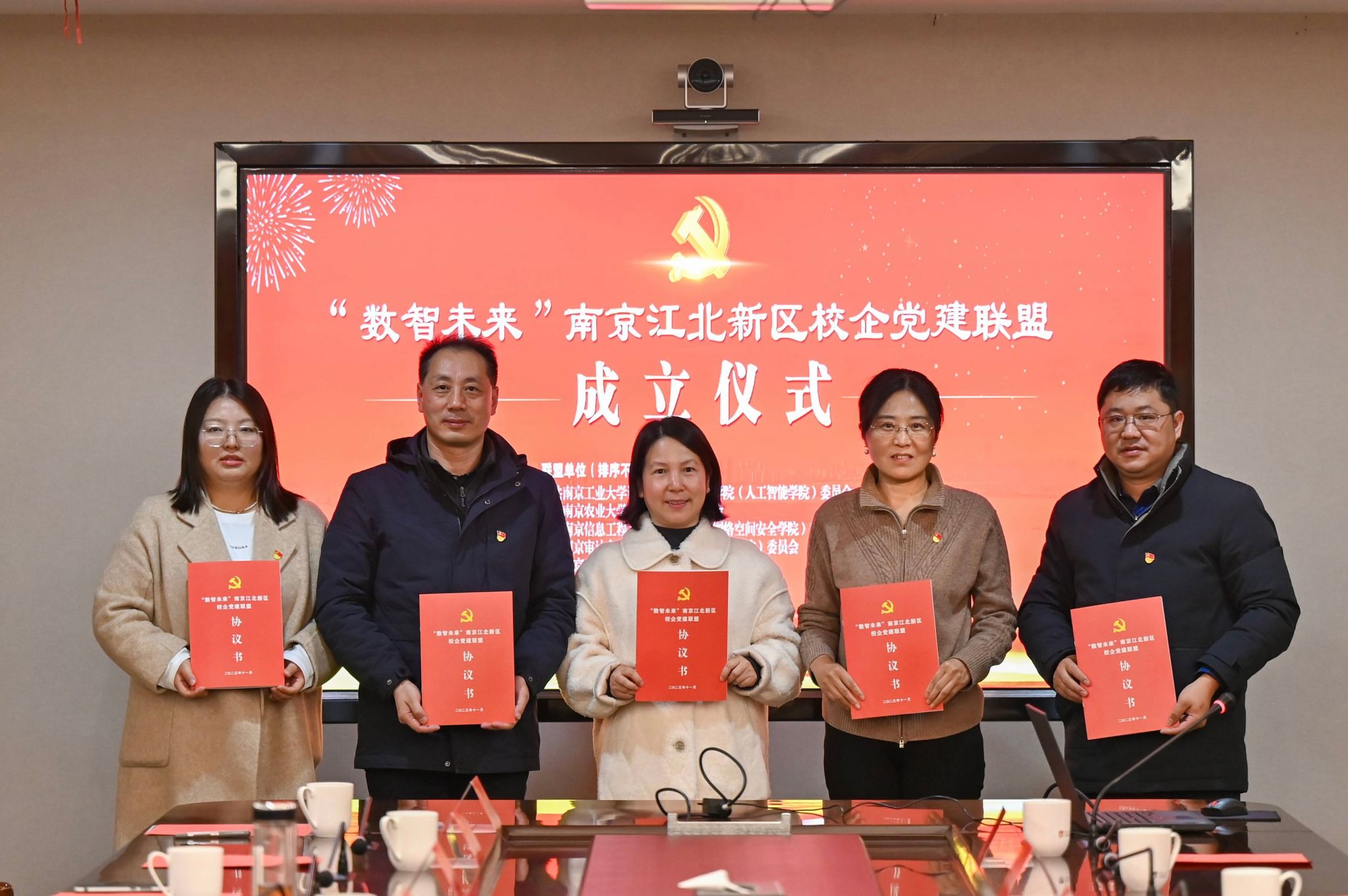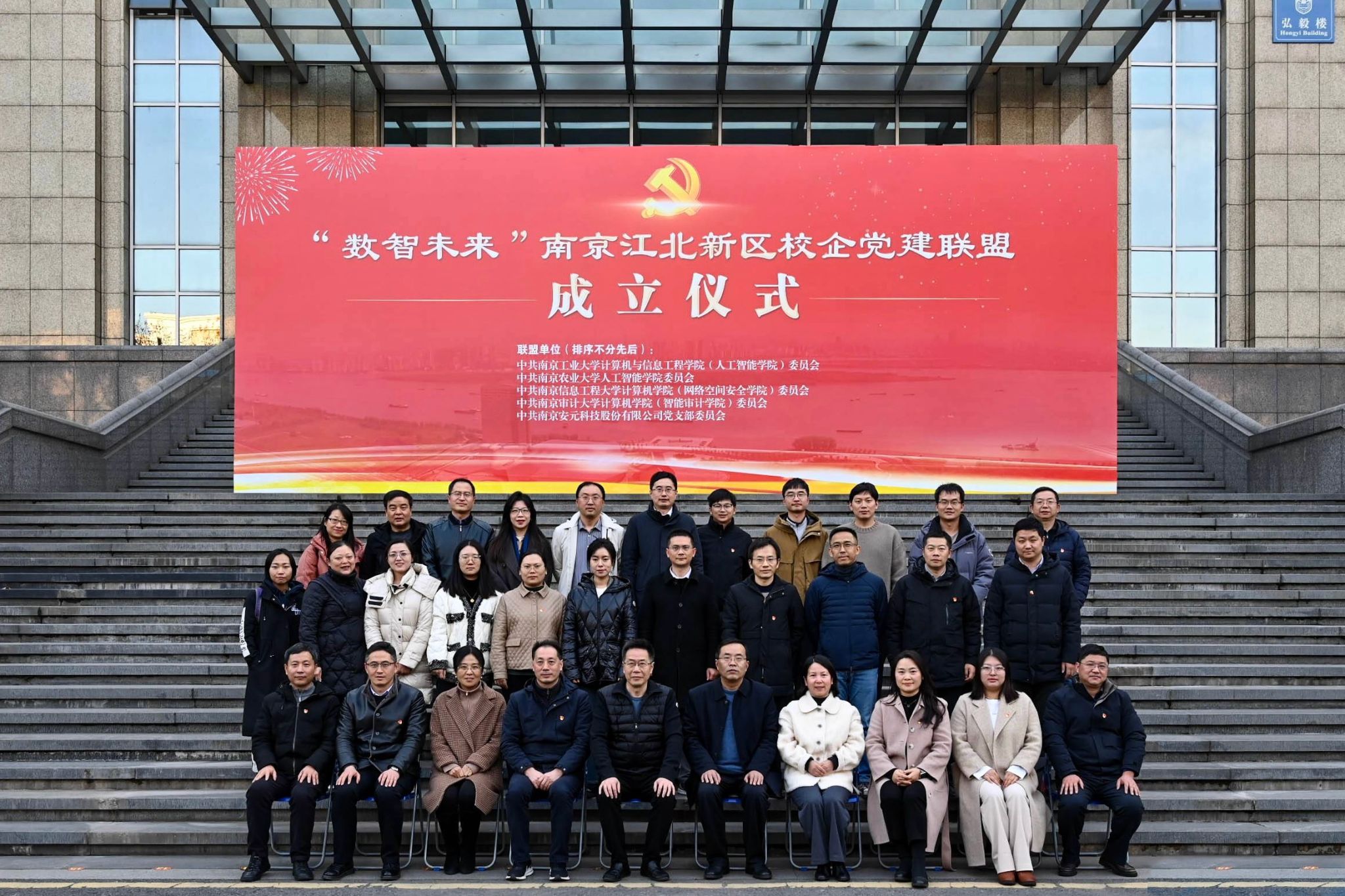 )、南京信息工程大学计算机学院(网络空间安全学院)、南京审计大学计算机学院(智能审计学院)、南京安元科技股份有限公司等南京江北新区内高校计算机类二级学院、企业党组织发起的“数智未来”党建联盟在南京工业大学正式成立。学院党委书记田永超带队参加成立仪式。