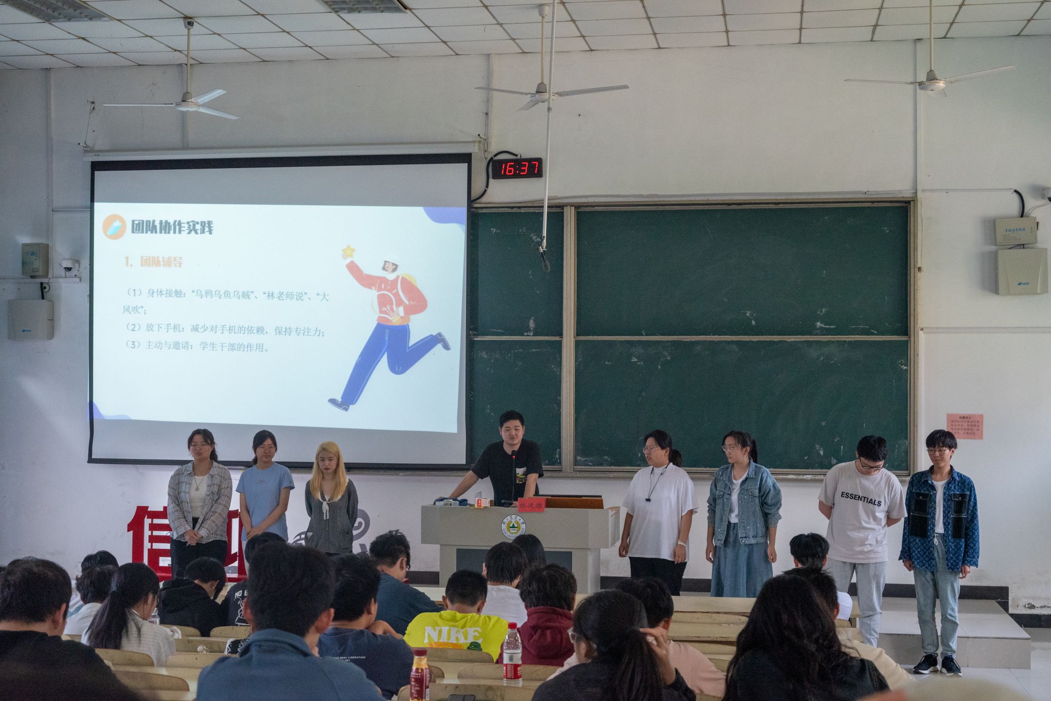 随后,主讲人林延胜便以团队建设为导向,介绍了学生工作的本质以及团队协作中涉及的心理学效应,为学生骨干做好组织建设提供了有益思路。期间,林延胜还通过精心设计的互动环节,巧妙激发了现场同学的学习热情,进一步加强了学生们的理解和掌握程度。接着,主讲人施芸芸则以自身丰富的学生组织经历为引,为大家介绍了学院组织框架以及工作划分原因,帮助在场干事更好地理解了自身职责所在,为后续的工作开展增添了信心。
