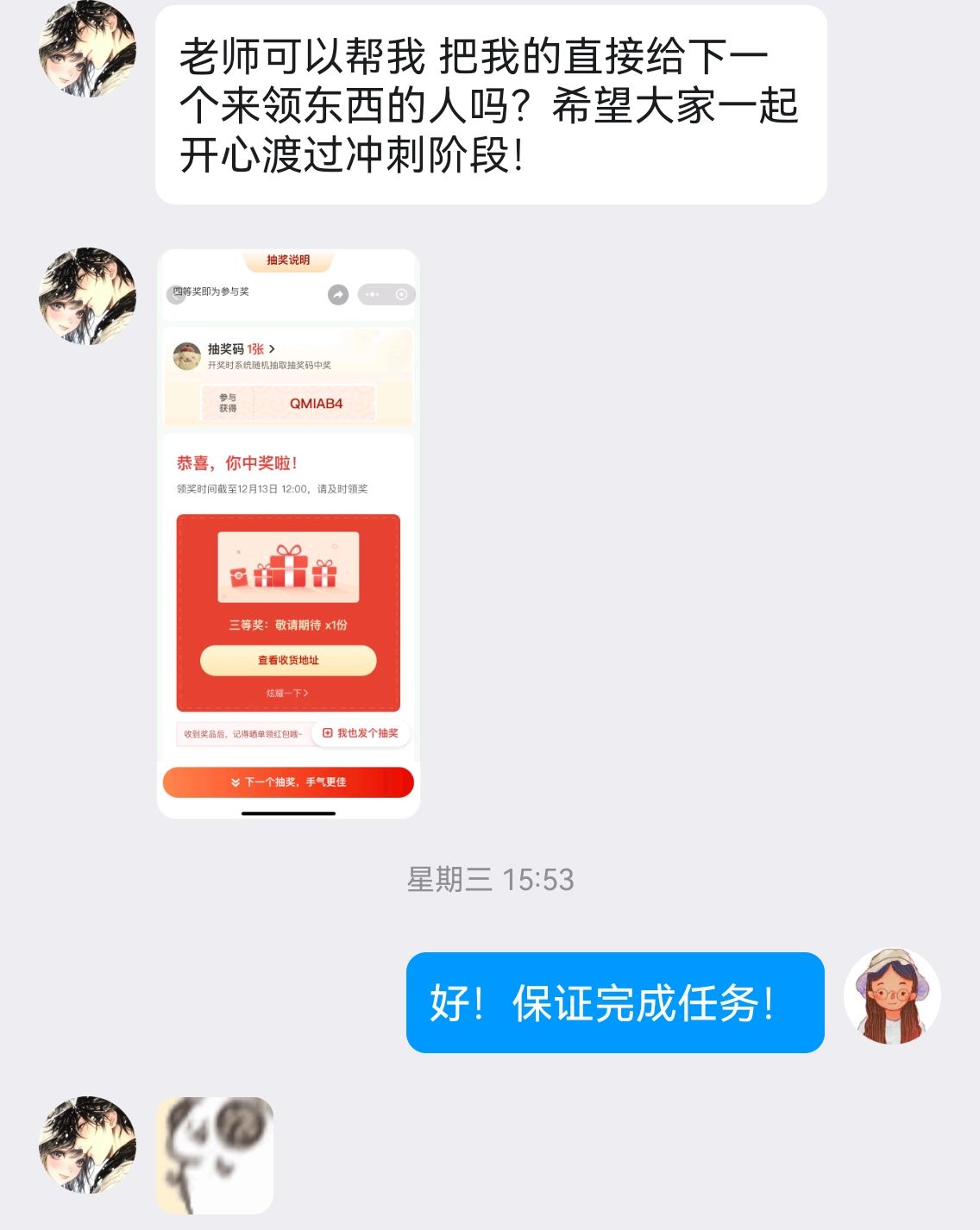 “老师可以帮我把礼物直接给下一位来领礼物的同学吗?希望大家一起开心度过冲刺阶段!”活动中考研学子们也互相传递喜悦与幸福,展现出智能院学子互帮互助的良好风貌。同时,未能及时到场领奖的学子们也收到了来自学院党员志愿者们送去教室与宿舍的祝福。