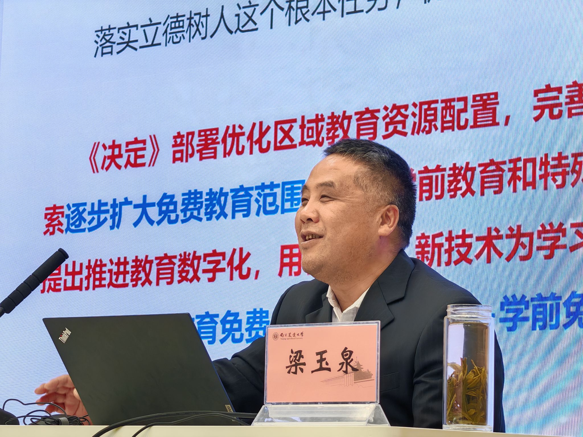 梁玉泉老师以习近平总书记的重要讲话为切入点,阐述了党的二十届三中全会的重大意义。他指出,全会的举行,彰显了以习近平同志为核心的党中央将改革进行到底的坚强决心和强烈使命担当。通过理论与实践案例相结合的讲授方式,梁老师带领师生全面领悟了进一步全面深化改革的指导思想。