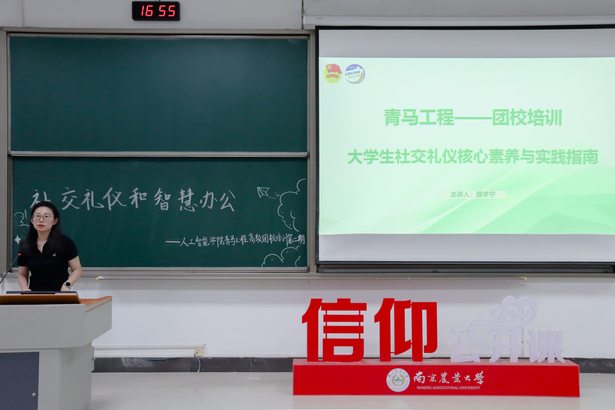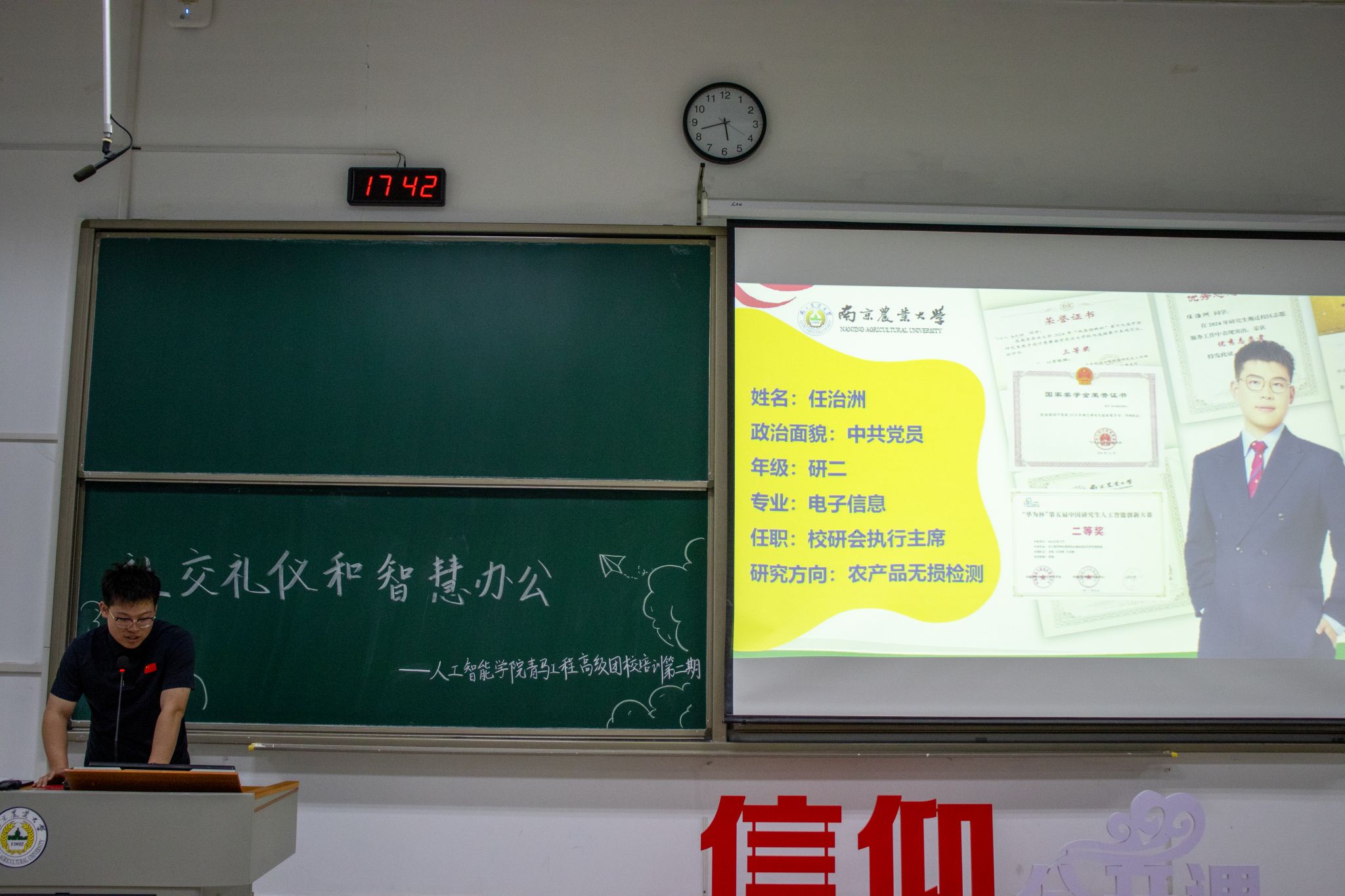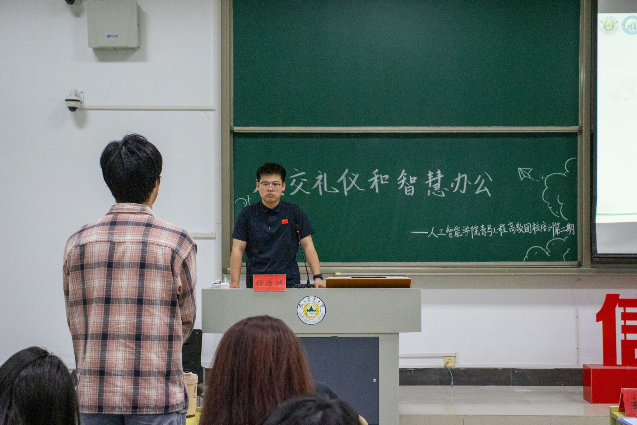 于博远楼C301举办信仰公开课系列高级团校培训之社交礼仪和智慧办公主题讲座。学院辅导员魏宇宁、2023级电子信息专业硕士研究生任治洲担任主讲,通过“职业软实力+数字硬技术”双轨教学模式,为全院学生组织成员带来一场立体化能力提升课。