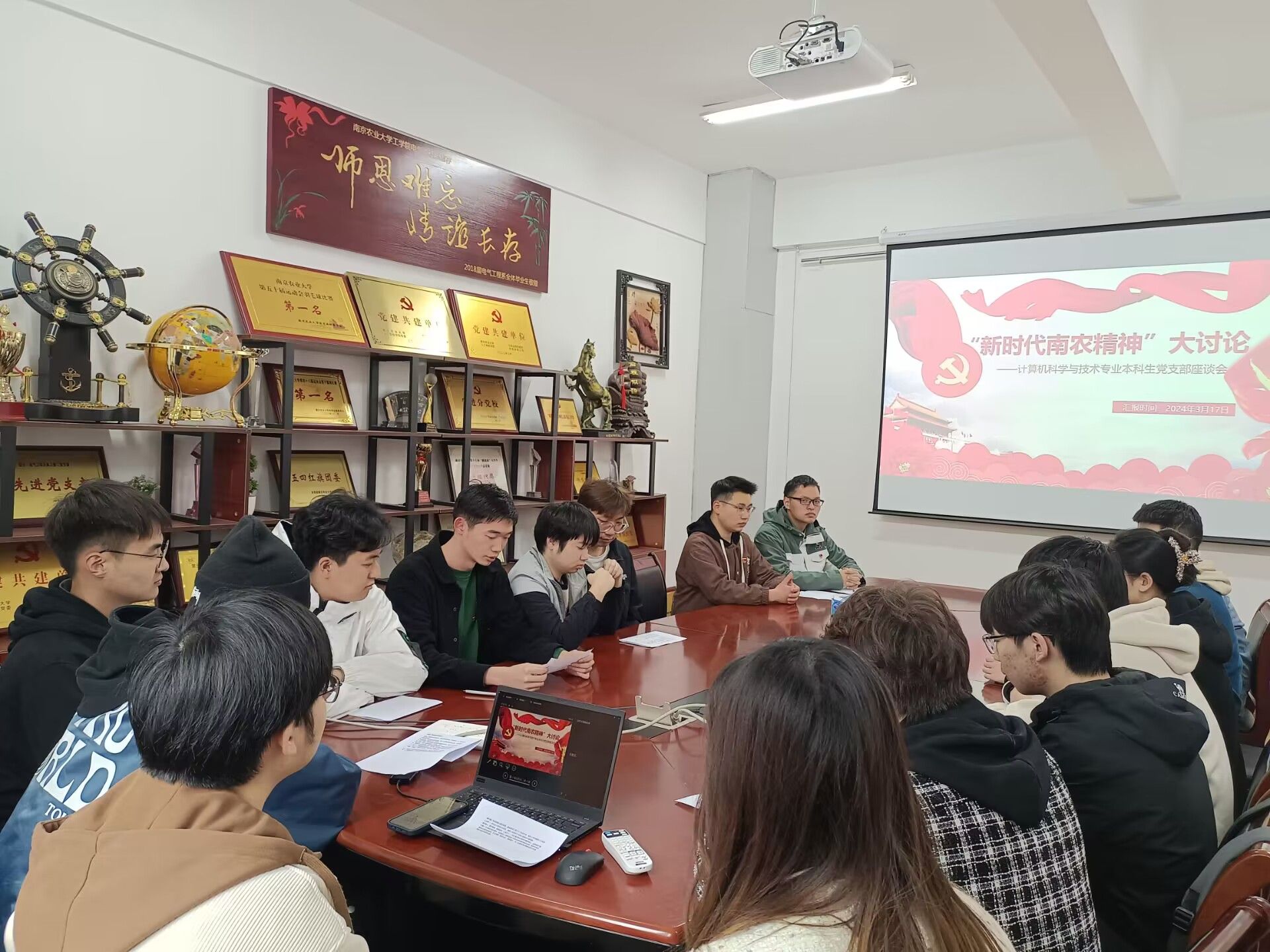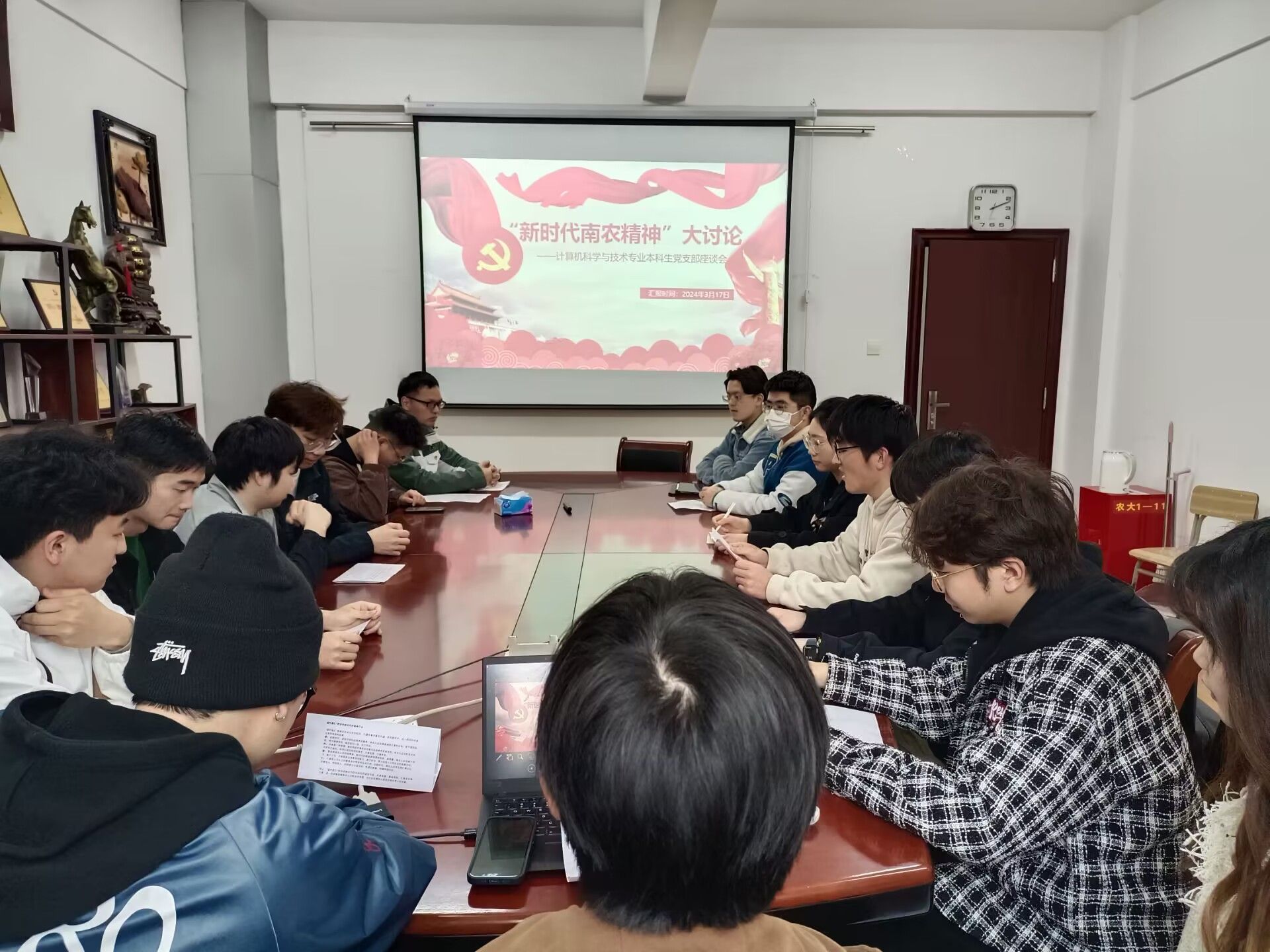 计算机科学与技术本科生党支部召开“新时代南农精神”大讨论座谈会。支部全体党员参会,会议由组织委员李南骏主持。