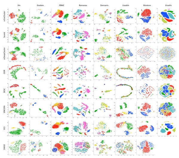 图3. 八种算法对单细胞RNA-seq聚类分析的可视化结果