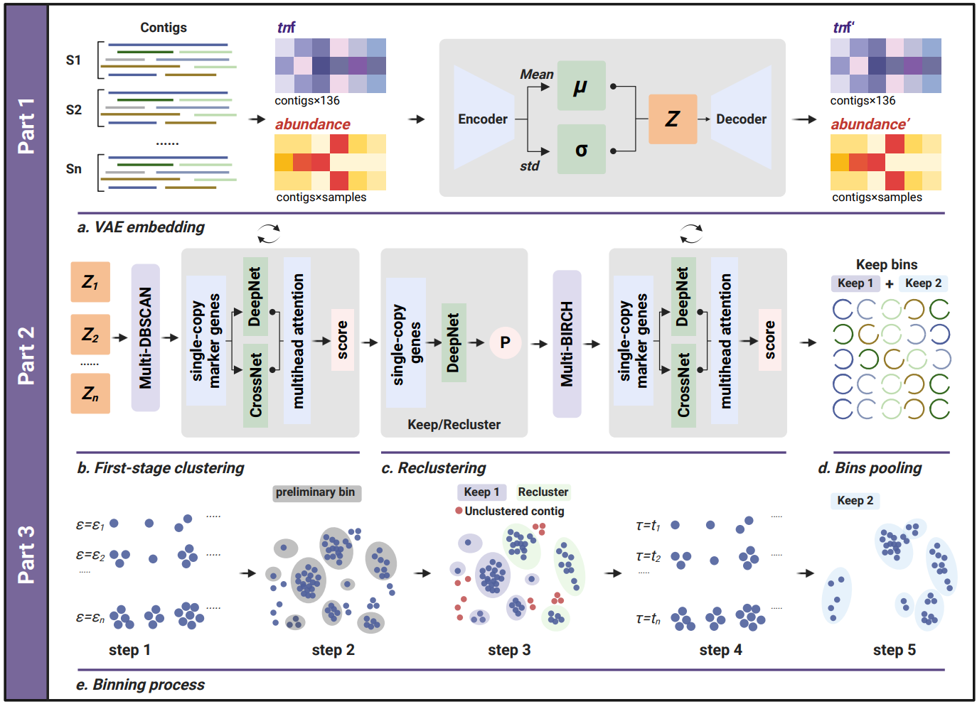 历经3年协同攻关,攻关小组创新了一种三代宏基因组长读分箱的无监督深度学习工具LorBin。该工具针对分箱全过程的卡点,从技术原理上提出四项针对性创新设计:1)适配变分自编码器训练学习复杂生境contigs特征分布,克服DNA大语言模型在处理长序列时面临的诸多挑战;2)构建两阶段多尺度自适应迭代聚类算法应对复杂物种空间分布,回收更多独特的未知微生物类群;3)在聚类过程中引入单拷贝基因集等信息引导的循环分箱质量评估模型,提升分箱质量和原始数据利用率;4)采用Transformer模型与统计概率模型,评估簇在高维空间的凹凸性对分箱效果的影响,解决高维生物数据嵌入特征在降维前后空间分布一致性评估的难题。