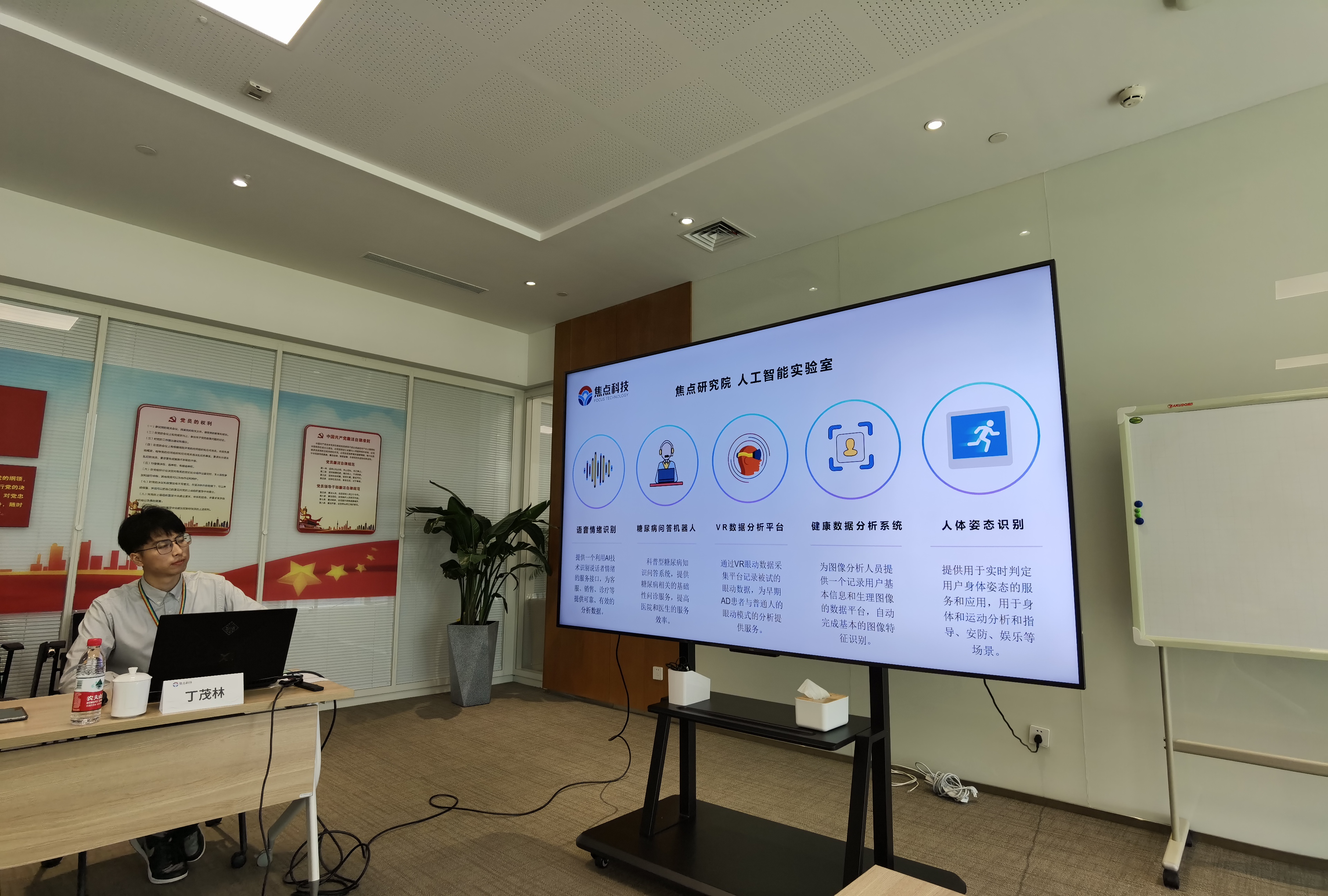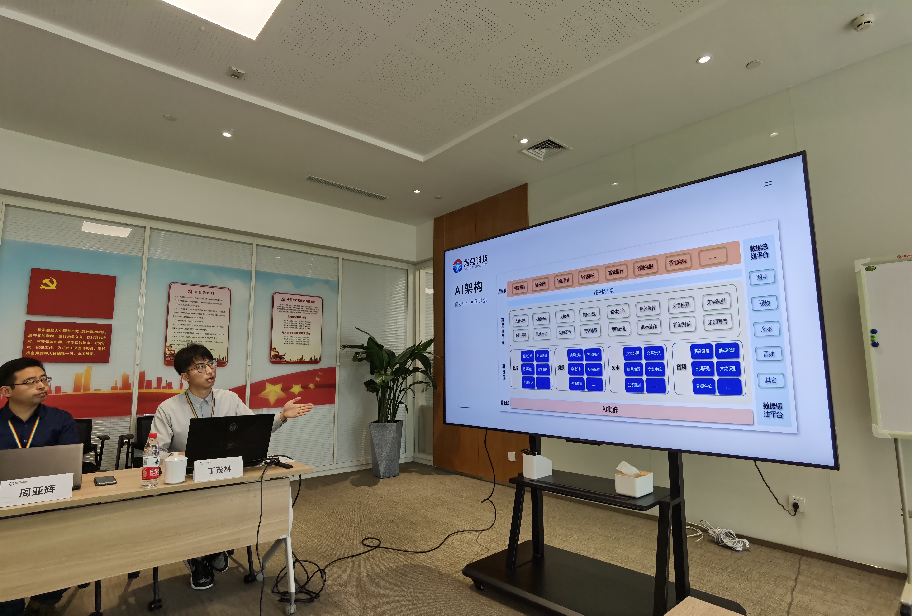 公司高级副总裁成俊杰、焦点科技研究院人工智能实验室负责人倪俊辉、研发中心AI部负责人房鹏展、人力资源组织与发展部负责人周亚辉、人力资源部校招项目经理丁茂林热情接待了麻豆tv 一行人,带领大家首先参观了解了公司大楼的办公布局与研发环境、专利展示墙等,以及极具人文关怀的配套生活休闲区域与设施。
