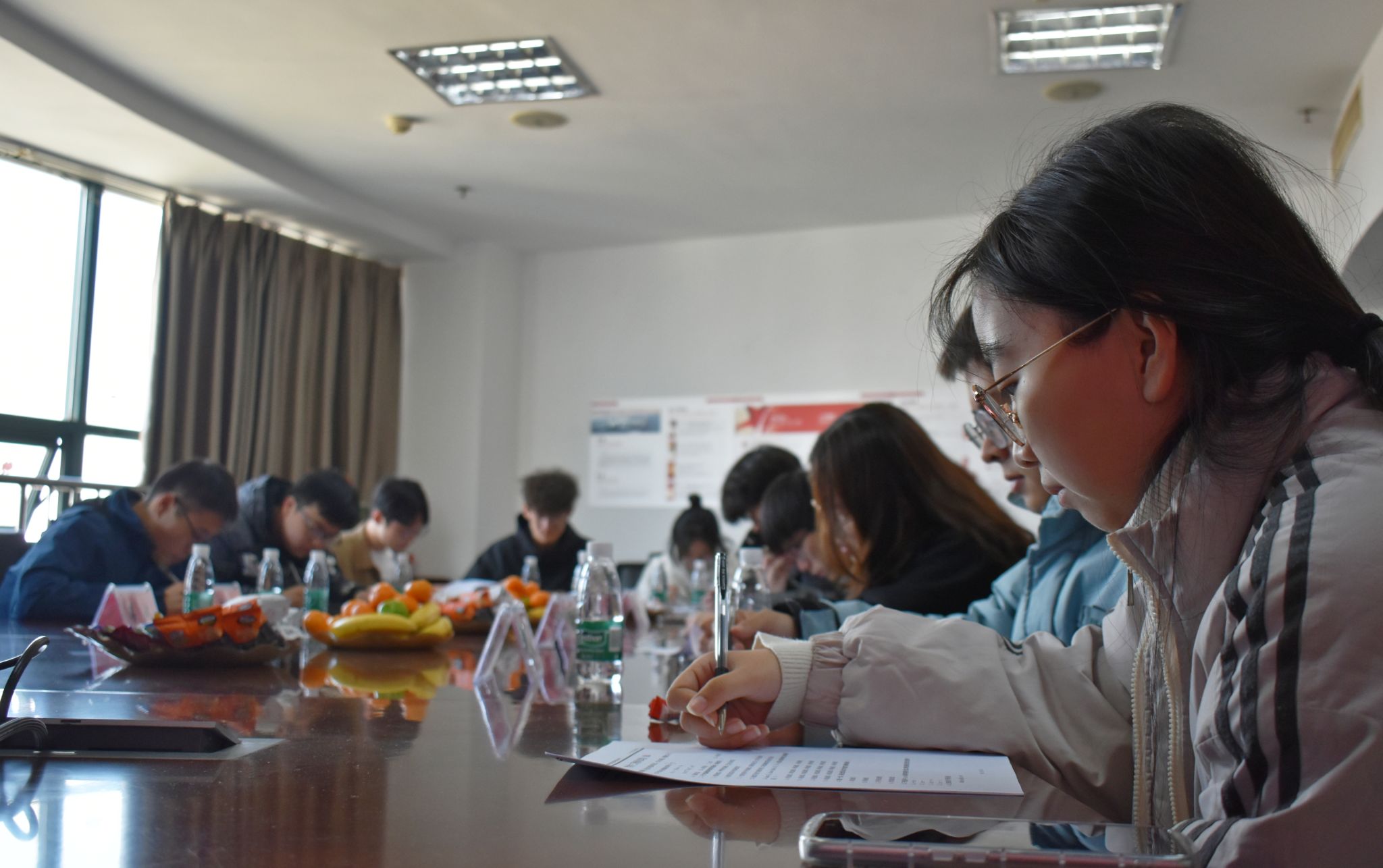 最后,“体验式求职锤炼”活动顺利开展,同学们步入考场认真完成了求职笔试环节体验。