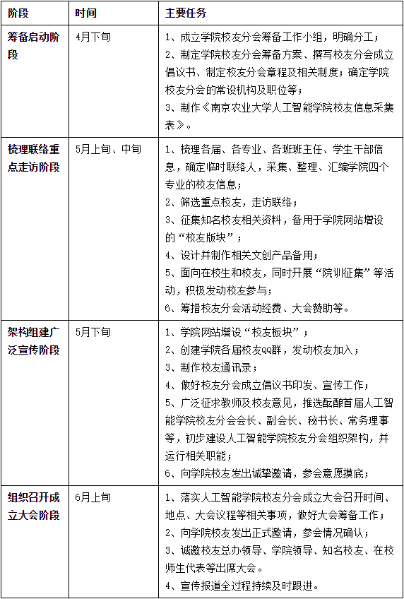 校友分会筹备工作主要分为四个阶段,即筹备启动阶段、梳理联络重点走访阶段、架构组建广泛宣传阶段、组织召开成立大会阶段。各阶段进度安排及主要工作任务详见下表:
